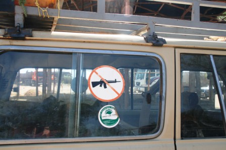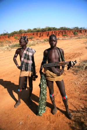 Peaaegu kolm tundi raputavat sõitu Jinkast Omo keskuse suunas viisid meid üle mägede ja tolmuste orgude. Esimene peatus tuli Mago rahvuspargi sildi juures, kus meie autosse hüppas skaut… kalašnikoviga. Just nii siin turvamehi kutsutakse. Kalašnikov on Omo orus umbes sama igapäevane asi nagu karjakoer – ainult et valjem ja oluliselt prestiižikam. Kuidagi on need siia üle Sudaani piiri smugeldatud ning kellel automaadiks raha pole, see teeb selle lihtsalt puust. Vorm on ju tähtsam kui funktsioon.