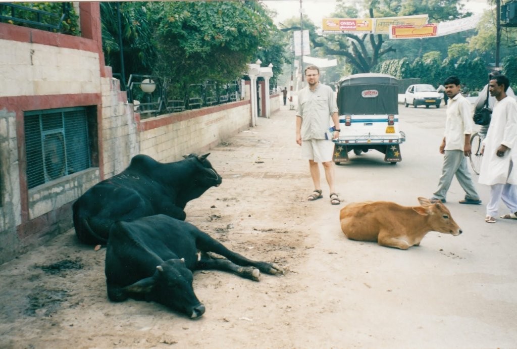 Eriti kentsakas oli vaatepilt, mis avanes ühel eriti kitsal kõrvaltänaval, kus liikus aeglaselt edasi üks Euroopa pensionäridest koosnev turismigrupp. Kõndimine meenutas pigem militaarset operatsiooni kui jalutuskäiku – grupi ees ja külgedel liikusid giidi abilised, kes pikkade bambuskeppidega lehmadele, rolleritele ja kohalikele uudishimulikele märku andsid, et tee vabastataks. Mõne pilgu järgi otsustades oli see sama tõhus kui soovida Gangeselt vaikust – aga vähemalt nad püüdsid.