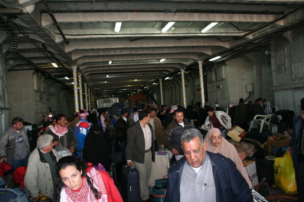 Sadamakail ootas meid ees sumisev inimparv, nad olid siia juhtumisi kokku kuhjanud kogu oma elamise. Tohutute pambuvirnade taga ja otsas ukerdas igasuguseid tegelasi, igaühel mingi tähtis asi ajada. Olime kuni selle hetkeni elanud teadmises, et satume reisipraami sadamasse. Tegelikkuses olime sattunud elava kaubavahetuse keskmesse või siis mingisse kummalisse põgenikevoolu. Igatahes kanti kogu see kraam laeva peale, mille tõttu praam hilines väljasõiduga pea poolteist tundi. Kuid lõpp hea, kõik hea – viimaks läks sõit lahti. Vaid paari tunni pärast paistis Egiptus – Nuweiba.
