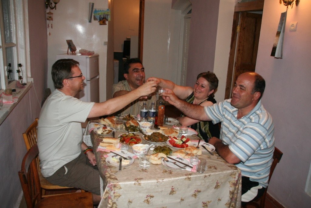 Istusime kõik ümber lauakese, mis lühikese ajaga täitus kõikvõimalike parimate Armeenia köögi paladega. Tagatipuks tehti veel ka kohalik puskar lahti ja hoogne toostide lausumine võis alata. Veel selgus tol õhtul meile Evelina seni hoolega varjatud pool – tema seljakoti põhjast tuli lagedale armeenia rahvuspill duduk. Õhtu edenes hoogsalt ja tooste jätkus varajaste hommikutundideni. Päris täpselt enam ei meenugi, kellele need kõik öeldud said.