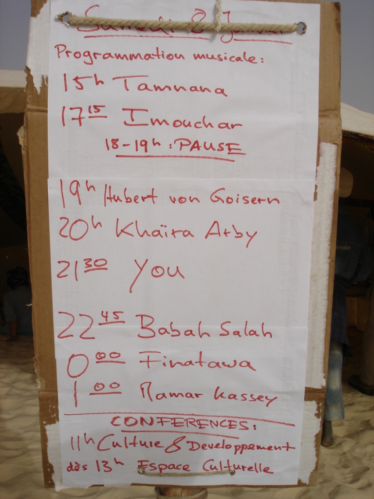 Kohalikele on kogu festival tasuta — turistidelt kogutud piletirahaga kaetaksegi tuhandete tuareegide kulud. Kolmepäevane pidustus oli tõeline kultuuripärli kogemus: tuareegid esitlesid oma kunsti ja muusikat, laval olid Mali parimad artistid sealhulgas ka Ali Farka Touré ning igal aastal kutsutakse esinejaid ka kaugemalt. Sel korral astusid üles muusikud Saksamaalt ja Indiast. Festival on olnud nii legendaarsete nimede lavaks nagu Robert Plant ja malilane Salif Keita. Kõik kontserdid algasid pimeduse saabudes, kui kuumus taandus ja kõrbeõhk muutus mõnusaks. Ja ausalt öeldes, see lisas kuulamiskogemusele erilise mõõtme. Istuda liival, Aafrika punase taeva all, ja lasta end kanda ürgsetel afrorütmidel — see viis täiesti teise dimensiooni.