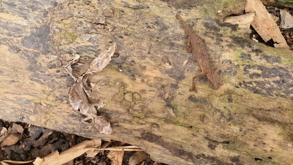 Näeme ka kameeleoneid, sealhulgas ka siinse piirkonna kõige väiksema isendit, mis on kuivanud puulehtede hulgas täiesti nähtamatu!