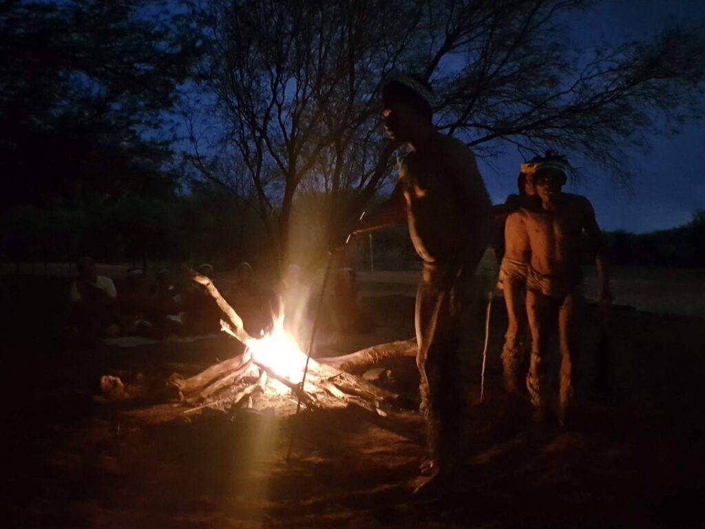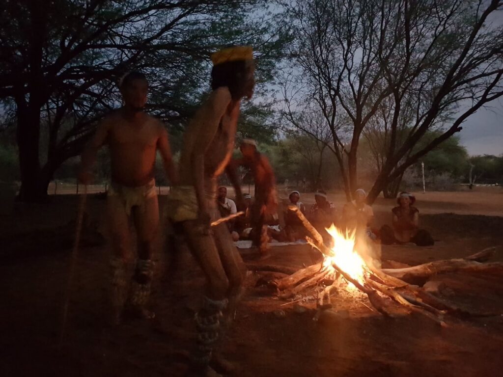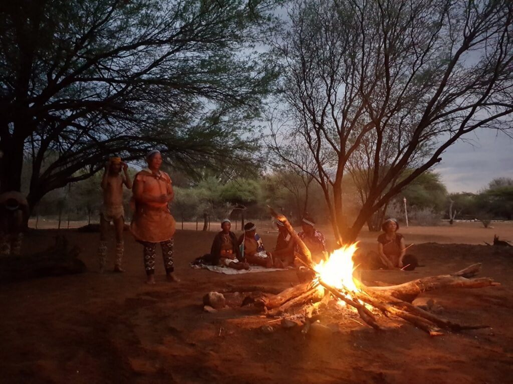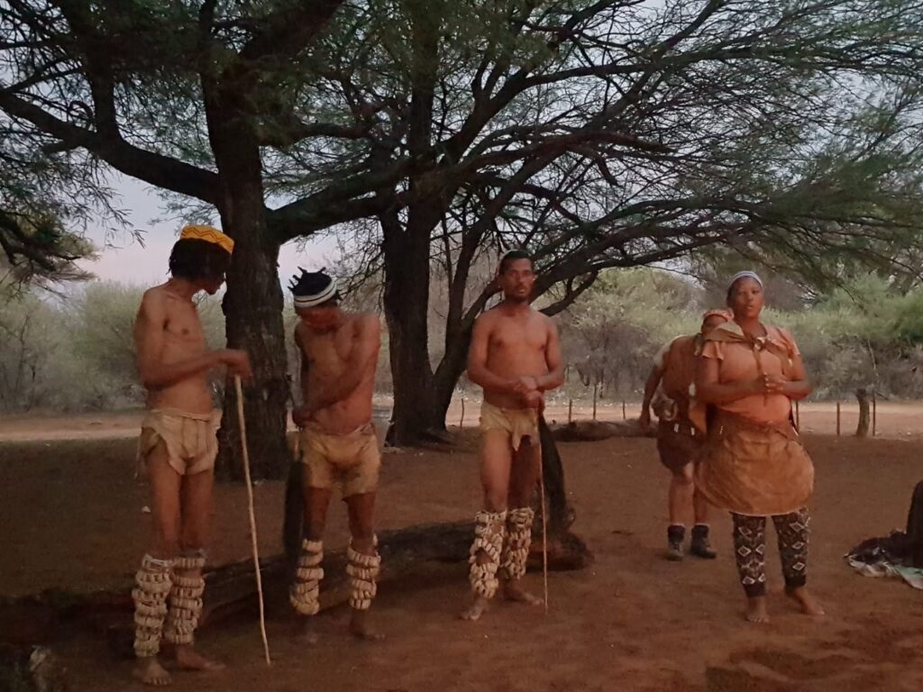 Viimase hommiku Maunis jätame veel suveniiride ostmiseks. Ostame seda, mida on, sest palju ei ole ning võtame suuna Ghanzi suunas. Ghanzi asub keset Kalahari kõrbe ning tihti kutsustakse seda ka Kalahari mitteametikuks pealinnaks. Õigupoolest oleks see linn meile ka niisama teepeale jäänud, teel tagasi meie reisu alguspunkt Windhoeki, aga kuna paarkümmend kilomeetrit ennem Ghanzit asub bushmanite poolt opereeritav Dqae Qare nimeline San lodge, siis otsustame, et tutvume kindlasti ka põliselanikega, kes on siin mail elanud viimased 20 000 aastat ning kellest tänaseks on alles jäänud vaid 100 000 ümber. Siinkandis nimetatakse bushmaneid Sani rahvaks. Erinevalt Himbadest Namiibias, Sanid enam traditsioonilisi riideid ja elukombeid igapäevaselt ei evi. Küll on nad aga lahkelt valmis meile esitama õhtupimeduses lõkke ääres oma iidseid tantse ja lugulaule. Naisterahvad istuvad kirevates rahvuskostüümides reas lõkkeääres ja sõnuvad kätteplaksutuste saatel rütmiliselt esiisade tekste. Meloodiat on raske eristada, tundub et peamiselt ongi retsitatiivne esitus. Mehed liiguvad loomanahkades ümber lõkke ja kõristavad rütmiliselt oma jalgade ümber seotud kaunviljadest tehtud kõristeid. Erinevaid liigutusi tehes ja poose võttes kujutatakse erinevaid jahisaake. Öises lõkkepimeduses muutub see kõik üha müstilisemaks ja kuigi üheltpoolt on korduvad rütmid monotoonsed, siis teisalt meditatiivsed, triivides mõtted eemale igapäeva tegevustest ning lähemale siinsete loodusrahvaste elu-olule.