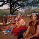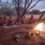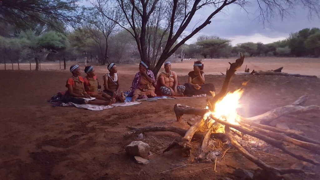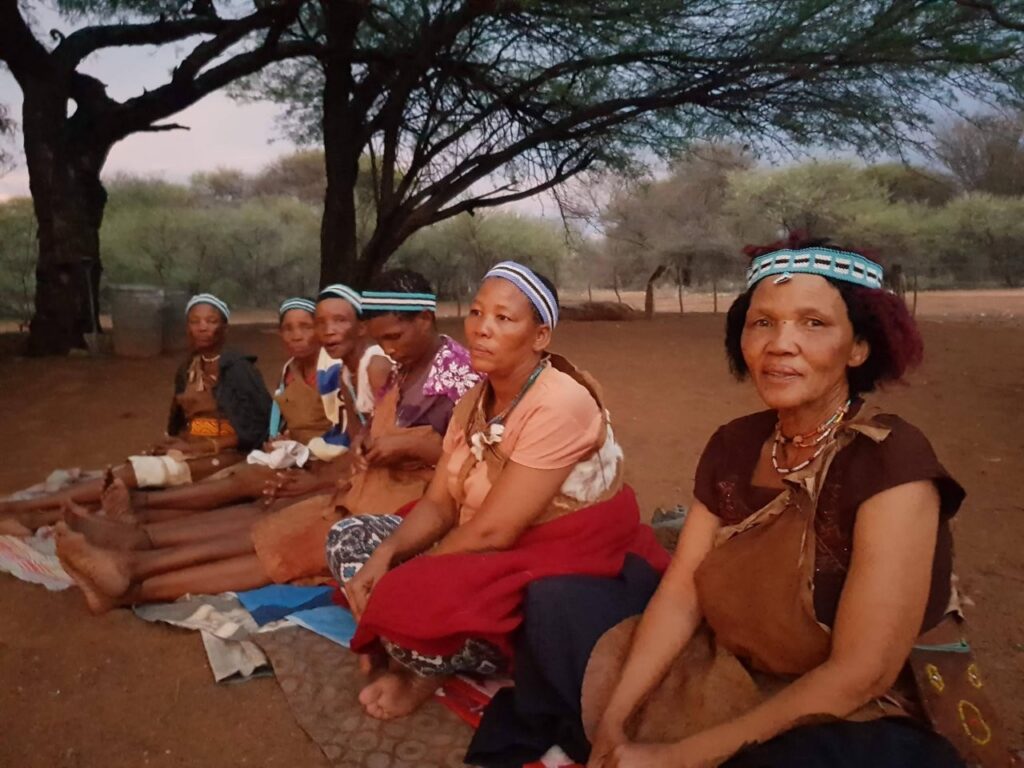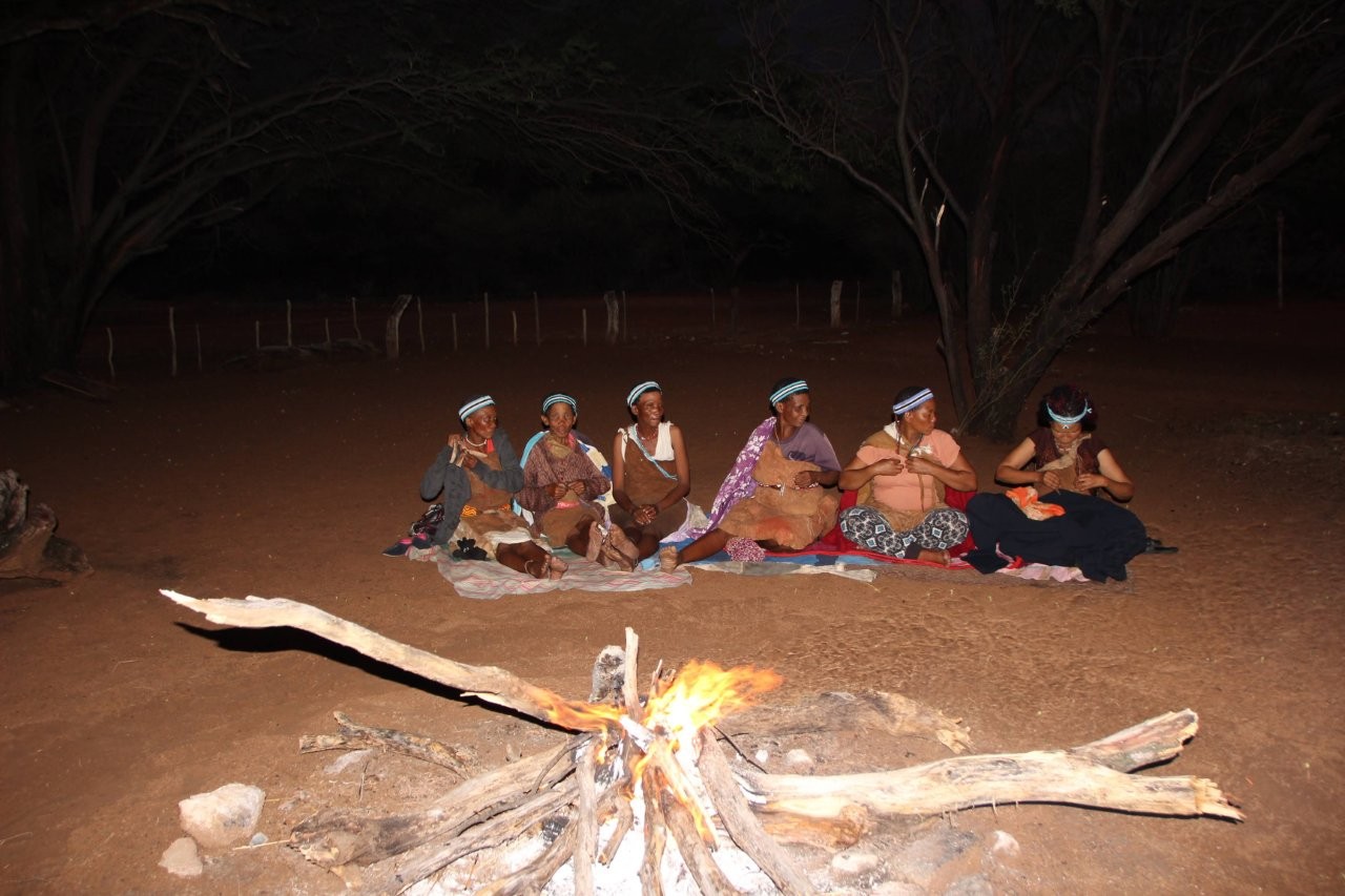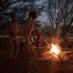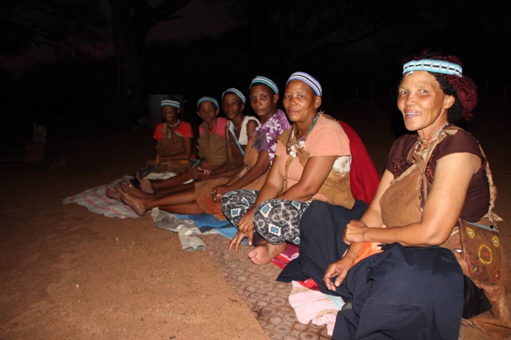Viimase hommiku Maunis jätame veel suveniiride ostmiseks. Ostame seda, mida on, sest palju ei ole ning võtame suuna Ghanzi suunas. Ghanzi asub keset Kalahari kõrbe ning tihti kutsustakse seda ka Kalahari mitteametikuks pealinnaks. Õigupoolest oleks see linn meile ka niisama teepeale jäänud, teel tagasi meie reisu alguspunkt Windhoeki, aga kuna paarkümmend kilomeetrit ennem Ghanzit asub bushmanite poolt opereeritav Dqae Qare nimeline San lodge, siis otsustame, et tutvume kindlasti ka põliselanikega, kes on siin mail elanud viimased 20 000 aastat ning kellest tänaseks on alles jäänud vaid 100 000 ümber. Siinkandis nimetatakse bushmaneid Sani rahvaks. Erinevalt Himbadest Namiibias, Sanid enam traditsioonilisi riideid ja elukombeid igapäevaselt ei evi. Küll on nad aga lahkelt valmis meile esitama õhtupimeduses lõkke ääres oma iidseid tantse ja lugulaule. Naisterahvad istuvad kirevates rahvuskostüümides reas lõkkeääres ja sõnuvad kätteplaksutuste saatel rütmiliselt esiisade tekste. Meloodiat on raske eristada, tundub et peamiselt ongi retsitatiivne esitus. Mehed liiguvad loomanahkades ümber lõkke ja kõristavad rütmiliselt oma jalgade ümber seotud kaunviljadest tehtud kõristeid. Erinevaid liigutusi tehes ja poose võttes kujutatakse erinevaid jahisaake. Öises lõkkepimeduses muutub see kõik üha müstilisemaks ja kuigi üheltpoolt on korduvad rütmid monotoonsed, siis teisalt meditatiivsed, triivides mõtted eemale igapäeva tegevustest ning lähemale siinsete loodusrahvaste elu-olule.