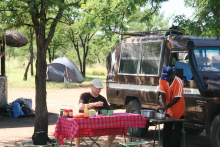 Ööbimiskoha suhtes kehtib reegel, et isegi telgikoht annab hinna poolest silmad ette linnas asuvatele hotellidele. Alla 60 USD maksvat telgikohta ei leidu. Kui telk ei sobi, peab valima mitmesajadollarilise lounge’i, sest vahepealset varianti ei ole. Telk on väga mugav, sest öine temperatuur alla 20 kraadi naljalt ei lange. Niisama võluv on ka asjaolu, et telgis ööbides on vahetuim võimalus tunnetada end osana loodusest, mida me ju olemegi. Kui väike riskitunne välja arvata, on telk parim valik. Ka muutub suurem osa loomi aktiivseks teadupärast just öösel, mis teebki asja põnevaks.