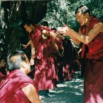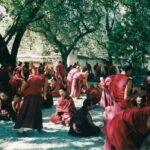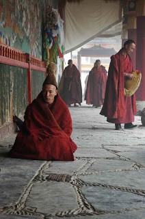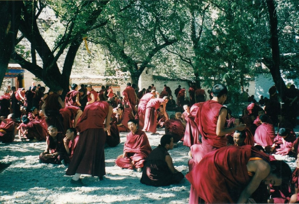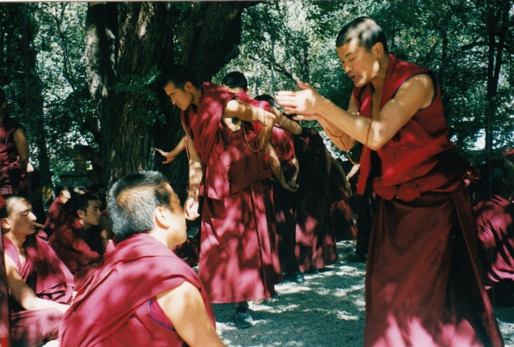 Punastesse hõlstidesse riietunud mungad olid kogunenud kloostriaeda, moodustades sadakonnast inimesest väiksemad neljaliikmelised grupid. Alguses ei saanud me kuidagi aru, et tegemist on õppimisega – pigem nägi kõik välja nagu mõne idamaise võitluskunsti trenn. Üks grupiliige seisis püsti ning esitas küsimusi, istujad vastasid valjuhäälselt ja ühtlaselt kooris. Iga vastuse lõppu tähistas hele plaks, mis käis kokku hoogsa käeliigutusega, vahel lisandus ka hüüatus – ja see kõik täitis kogu kloostriaia ebatavalise rütmi ja energiaga.