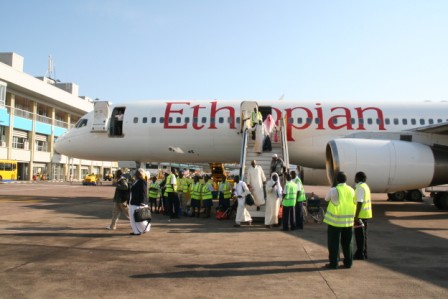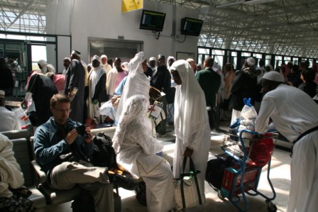 Pärast ligi ööpäevast lendu läbi Stockholmi, Rooma ja Addis Abeba maandusime lõpuks Entebbe lennuväljal. Viimasest vahemaandumisest alates oli lennuk kiiresti täitunud valgetes rüüdes reisijatega – need olid palverändurid, kes naasid Mekast pärast kuuajalist hadžit. Ehkki Uganda elanikkonnast moodustavad moslemid vaid umbes viis protsenti, olid kõik saabunute omaksed suutnud kogu Entebe lennuvälja ära ummistada, nii et viivuks jäi mulje, et see protsent on otse vastupidine. Ilma pikema sissejuhatuseta pandi kohapeal lennuvälja esisel parkimisplatsil kohe korralik, vägagi särtsakas pidu püsti: kõlas pillimeeste ansambel, lauldi, tantsiti, lehvitati ja hõiguti – nagu Aafrikas ikka, ei vajata peo jaoks palju, piisab põhjusest ja inimestest.